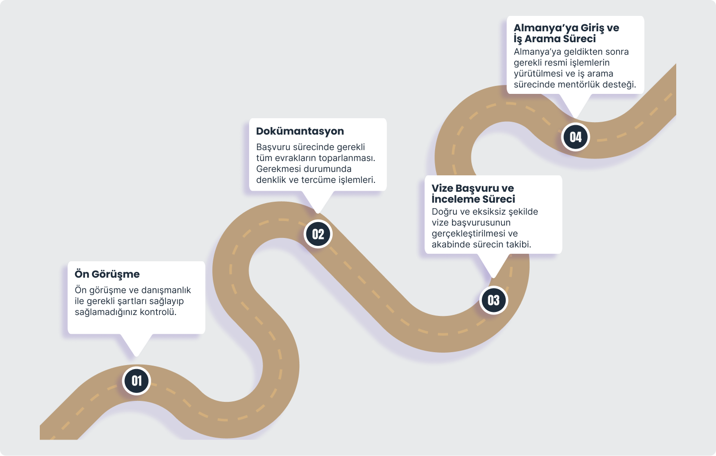 Almanya’da kariyer yapmak isteyen danışanlarımız için başvuru öncesinden vize dönüşümüne kadar tüm süreci profesyonelce yönetiyoruz.